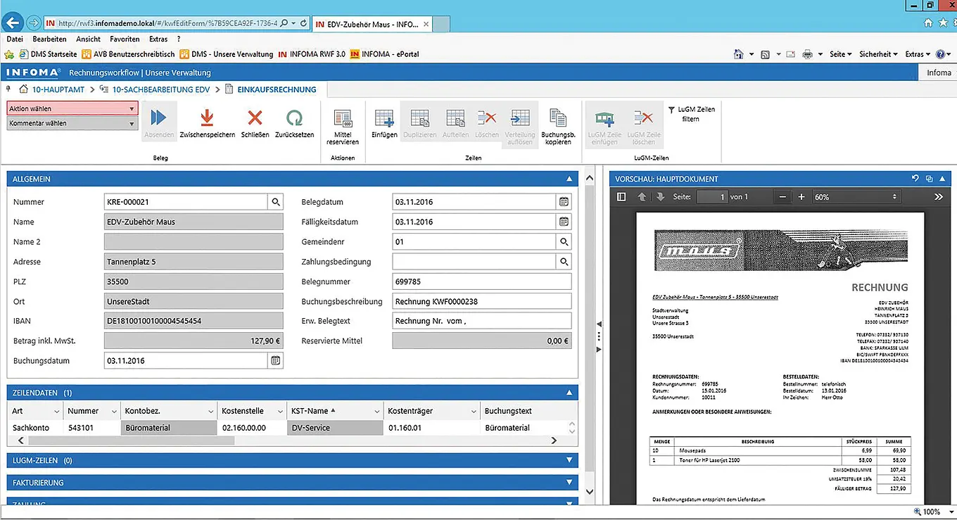 Handles structured preparation of eInvoice data, no matter the format. All invoice data is intelligently enriched and supplemented with added value content – no matter whether it is received electronically from portal and cloud services, via e-mail, DE-mail, interfaces, in paper form as a letter or fax, or as a PDF – such as suggestions from historic accounting data for a current account assignment.